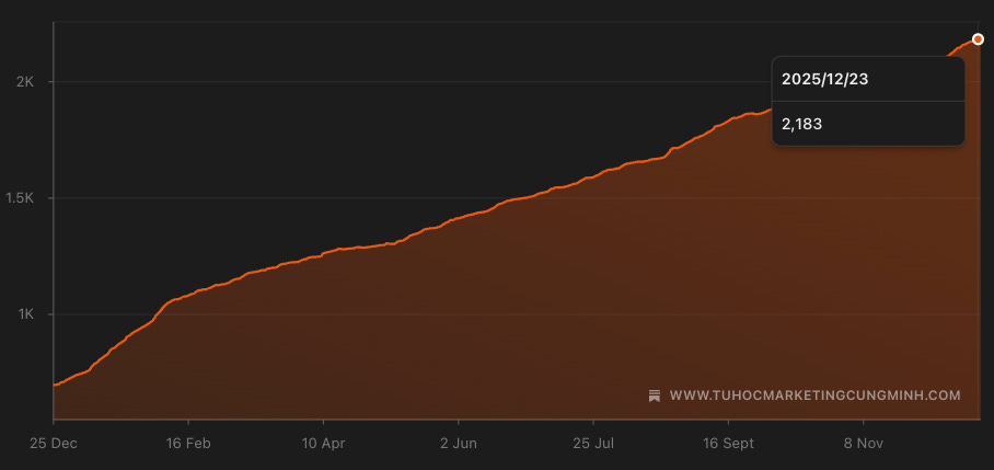 Tính đến thời điểm mình viết Newsletter này Tự Học Marketing Cùng Mình có 2,183 bạn độc giả (Subscriber). Con số này đến một cách hoàn toàn organic, mình không làm gì nhiều ngoài việc chia sẻ Note (không thường xuyên trong năm 2025, nhưng sẽ thường xuyên trong năm 2026) trên Substack Network và Traffic tự nhiên từ Google.