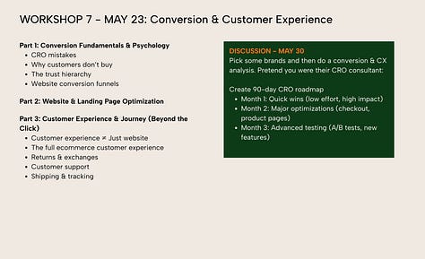 Vì vậy cho nên Ecommerce Business Intensive Course của mình sẽ không đi theo kiểu “Tuần 1: Facebook Ads, Tuần 2: Email Marketing, Tuần 3: SEO….” Nếu mình làm kiểu đó, mình đang đi ngược lại với chính những gì mình đã chia sẻ trên Newsletter Tự Học Marketing Cùng Mình.