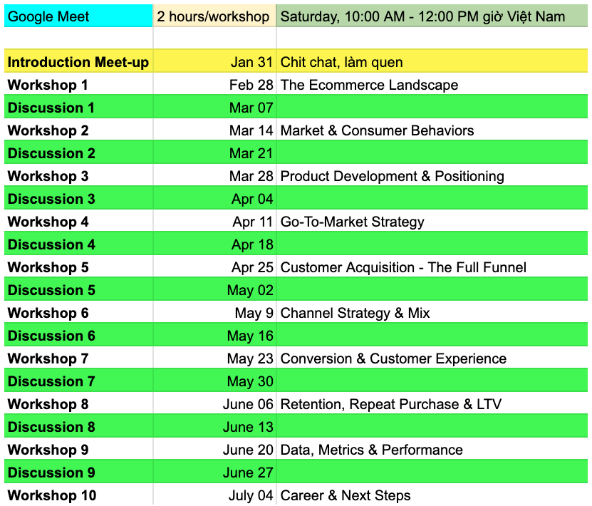 Duration: 1 Introduction Meet-up (chit chat, làm quen, 2 hours) + 10 workshops (2 hours/workshop) + 9 Discussions (2 hours/discussion). Cứ sau mỗi Workshop sẽ có một Discussion sẽ thảo luận về các bài tập mà mình đã giao và FAQs.
