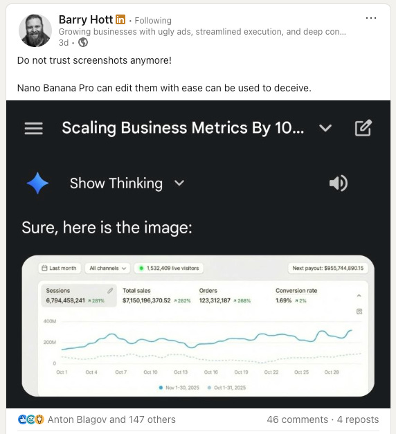 Nếu Shopify Dashboard có thể được làm giả dễ dàng như vậy thì còn gì nữa? Những Case Study trên LinkedIn? Những con số tăng trưởng Agency khoe khoang? Những lời chứng thực từ khách hàng? Những bài đăng viral về thành công? Video với hình ảnh con người thật dùng sản phẩm?… Với sức mạnh của ChatGPT, Gemini, Claude, và giờ là Nano Banana Pro… nếu gần như cái gì cũng có thể được làm giả một cách tinh vi, vậy người làm Marketing chúng ta nên đứng ở đâu trong một thế giới mà ai cũng có thể vẽ ra bất cứ điều gì mình muốn? Làm sao để khách hàng tin chúng ta khi niềm tin đang trở thành một loại tài sản ngày càng khan hiếm? Làm sao để một bài viết trên mạng không bị xem như chỉ là một mẩu nội dung vô danh trong thế giới cực kỳ ồn ào này? Quan trọng nhất là làm sao để chính chúng ta, Business Owner và Marketer không bị cuốn vào xu hướng phải dùng AI, phải làm cho đẹp, cho nhanh, cho giống người khác?