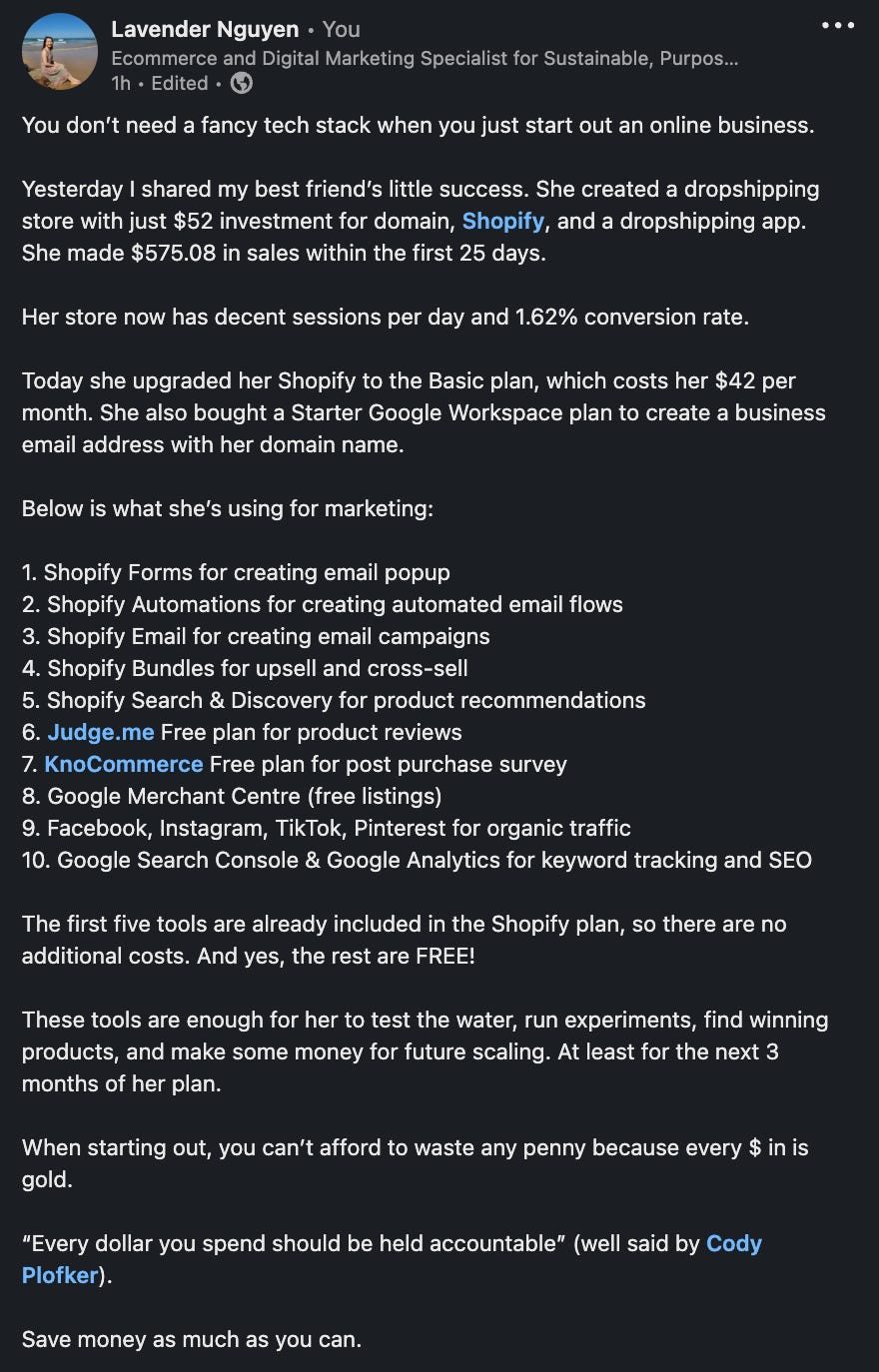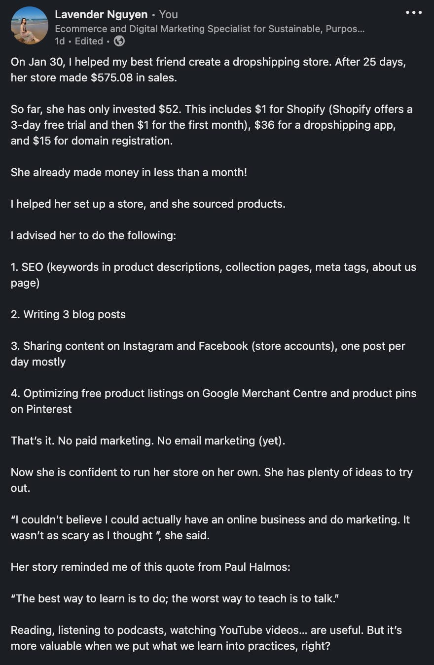Mình tin chắc nếu bạn dành thời gian build một dropshipping store rồi làm marketing cho nó, chỉ cần 1 tháng hoặc thậm chí 2 tuần thôi là bạn đã thấy mình “như bước sang một trang” mới ngay. Nói chuyện cứ phải gọi như ecommerce marketer chính hiệu!
