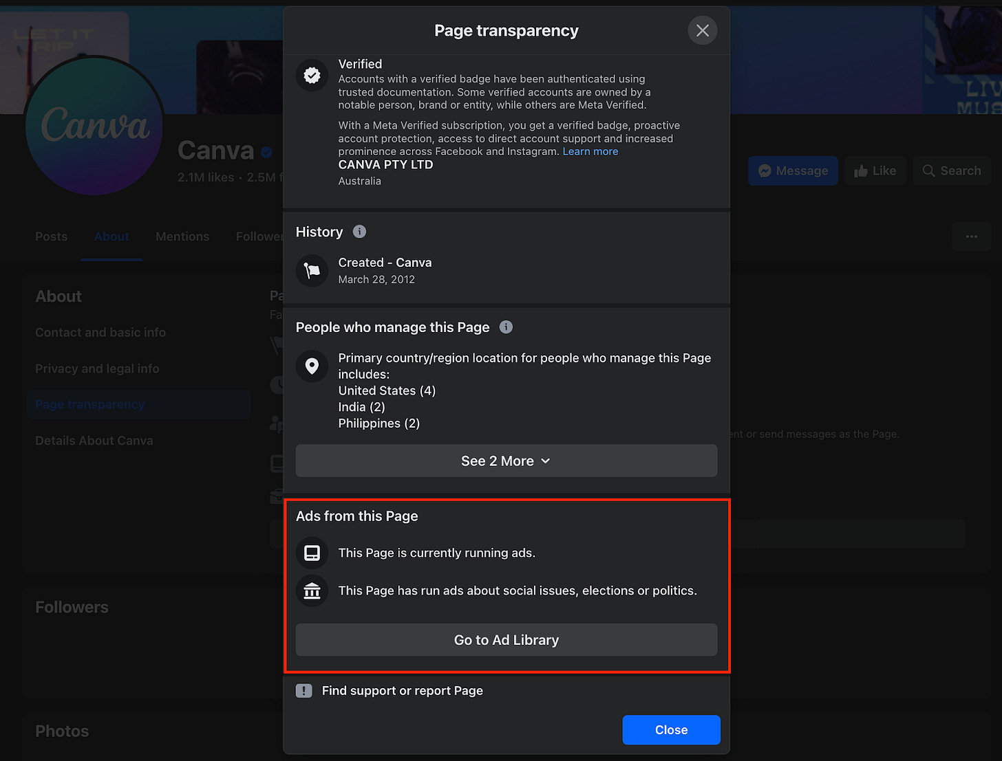 Một cách khác để kiểm tra xem một brand có đang chạy quảng cáo hay không là vào Facebook page của họ > About > Page Transparency > See All. Nếu page đang chạy quảng cáo thì sẽ có dòng chữ “This Page is currently running ads”. Bạn chỉ cần click vào button “Go to Ad Library" là sẽ xem được hết các quảng cáo của họ.